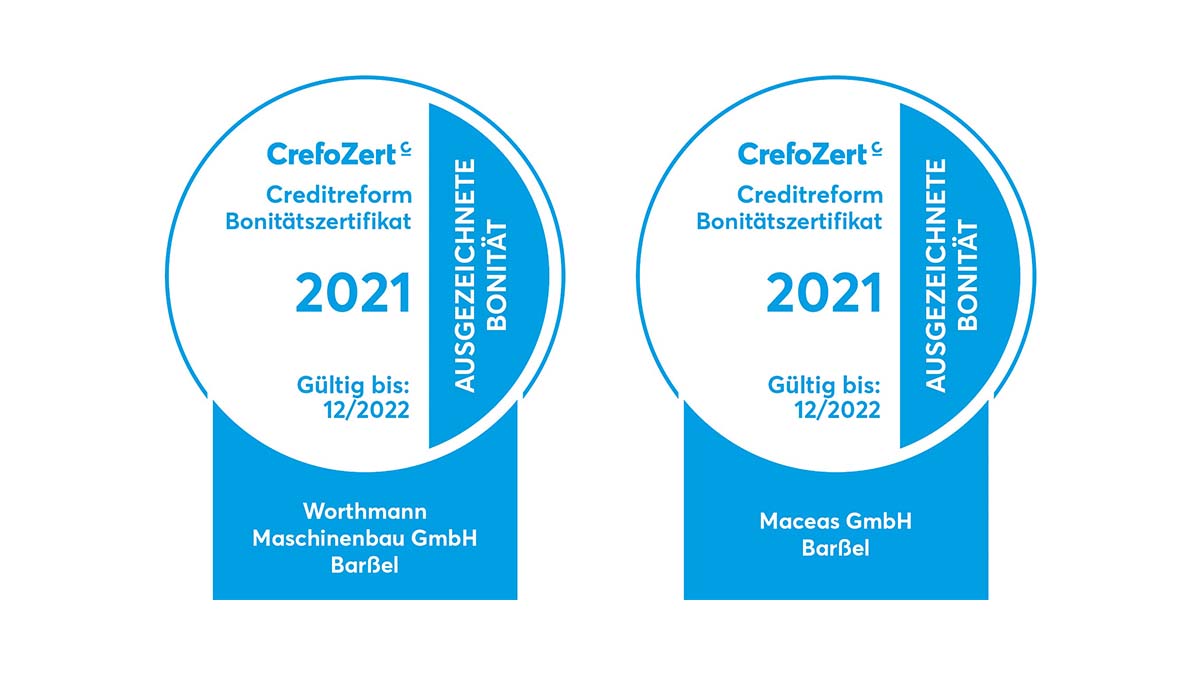 Wir freuen uns sehr, dass der Worthmann Maschinenbau GmbH und der MACEAS GmbH auch in diesem Jahr das Creditreform Bonitätszertifikat CrefoZert verliehen wurde. Nur 2% der wirtschaftlich bedeutenden Unternehmen Deutschlands schaffen das und können die dafür erforderlichen Auflagen erfüllen. Die Grundlagen zur Verleihung der Auszeichnung sind professionelle Jahresabschlussanalysen durch die Creditreform Rating AG (BaFin-zertifiziert), die […]
