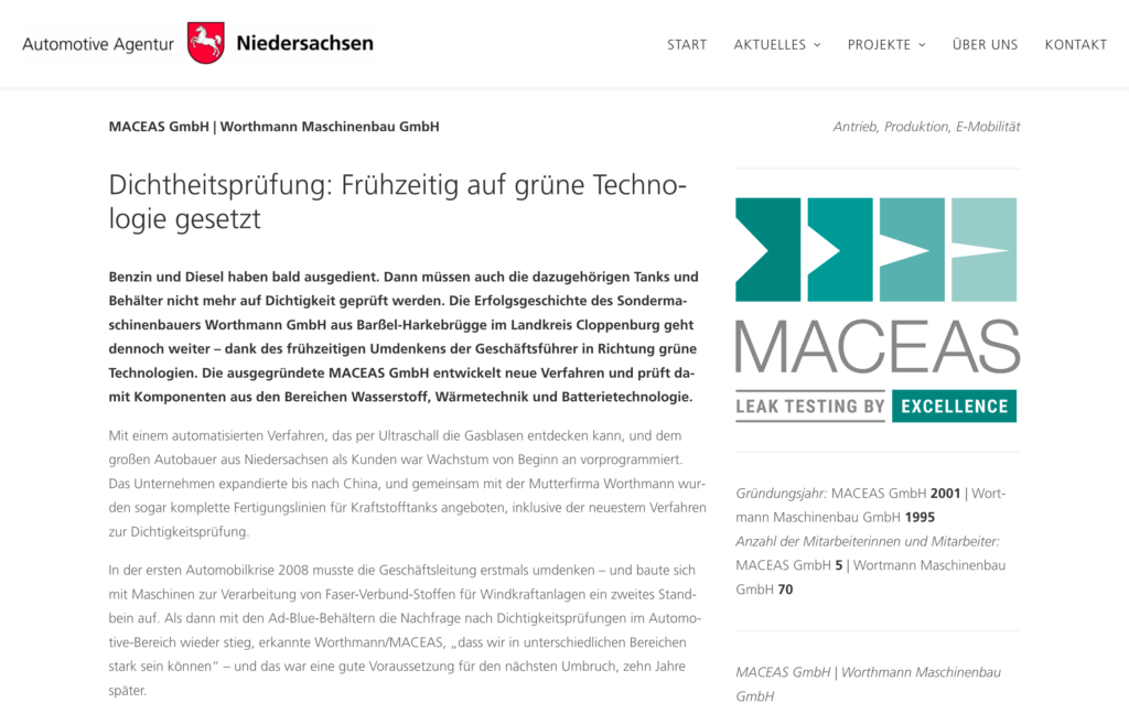 Die MACEAS GmbH, bekannt für Innovationen im Bereich grüne Technologien, wurde kürzlich von der Automotive Agentur Niedersachsen als Best-Pratice-Beispiel hervorgehoben. Die Auszeichnung spiegelt das Engagement von MACEAS für nachhaltige Lösungen und die erfolgreiche Umstellung auf alternative Antriebstechnologien und Lösungen wider.