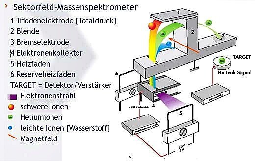 Bei diesem Verfahren ist als Sensor ein Massenspektrometer notwendig. Die Heliumatome werden mit Hilfe eines Elektronenstrahls ionisiert. Die nun